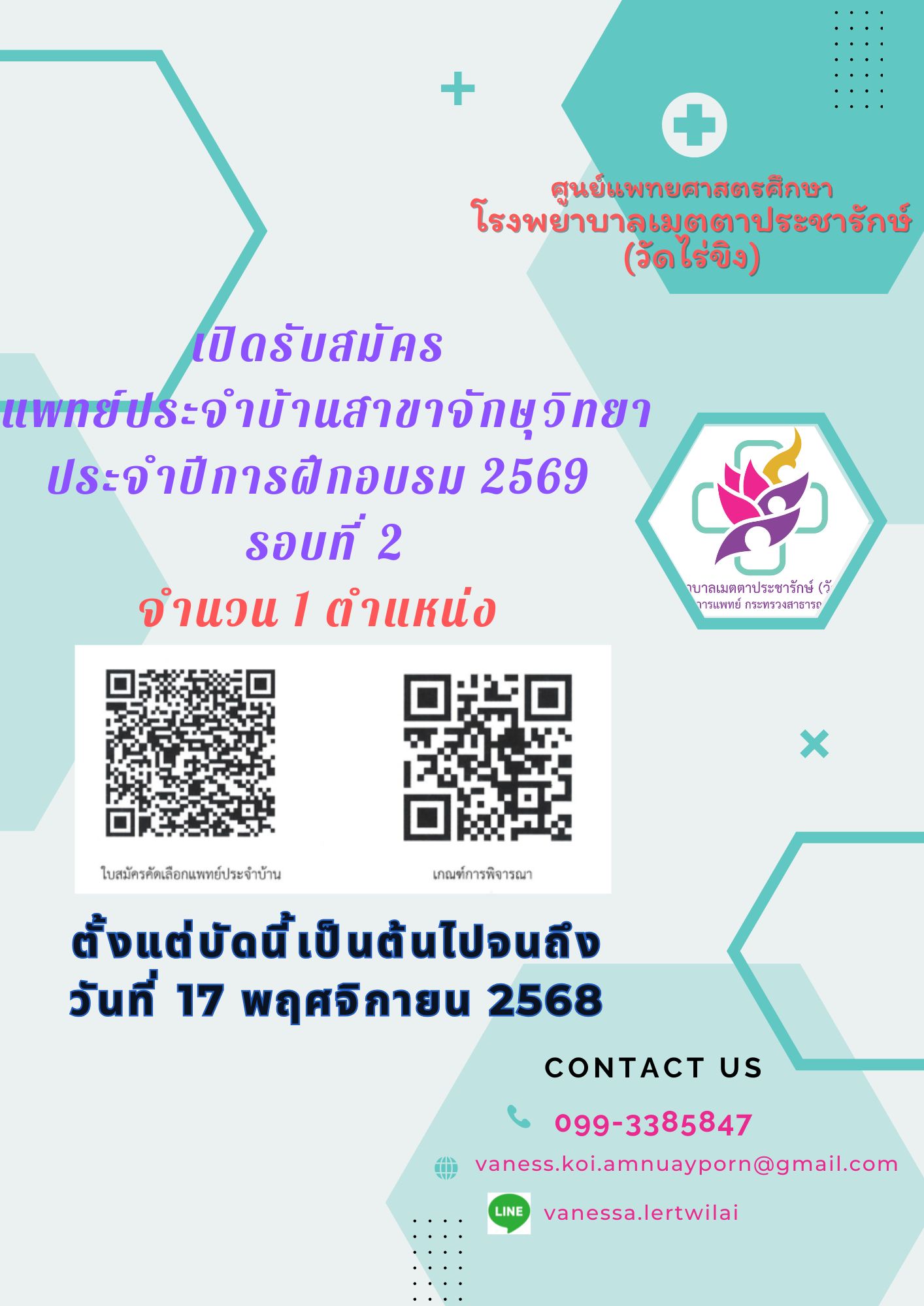 โรงพยาบาลเมตตาประชารักษ์(วัดไร่ขิง) เปิดอบรมเรื่อง METTA-SH9H COLLABORATION IN OCULOPLASTIC FIELD ในวันอังคารที่ 11 พย. 2568 เวลา 13.00น. ถึง 16.30น.